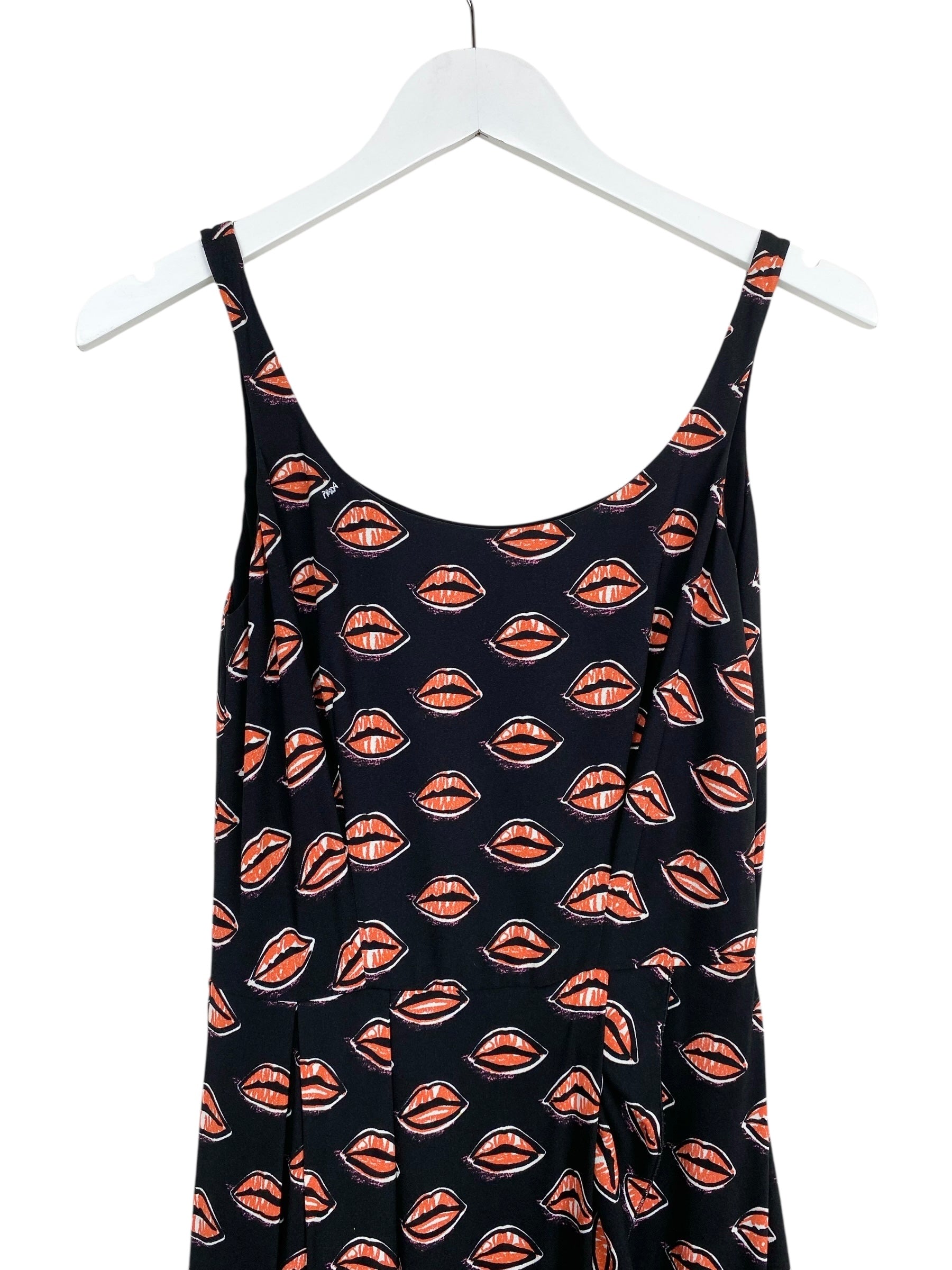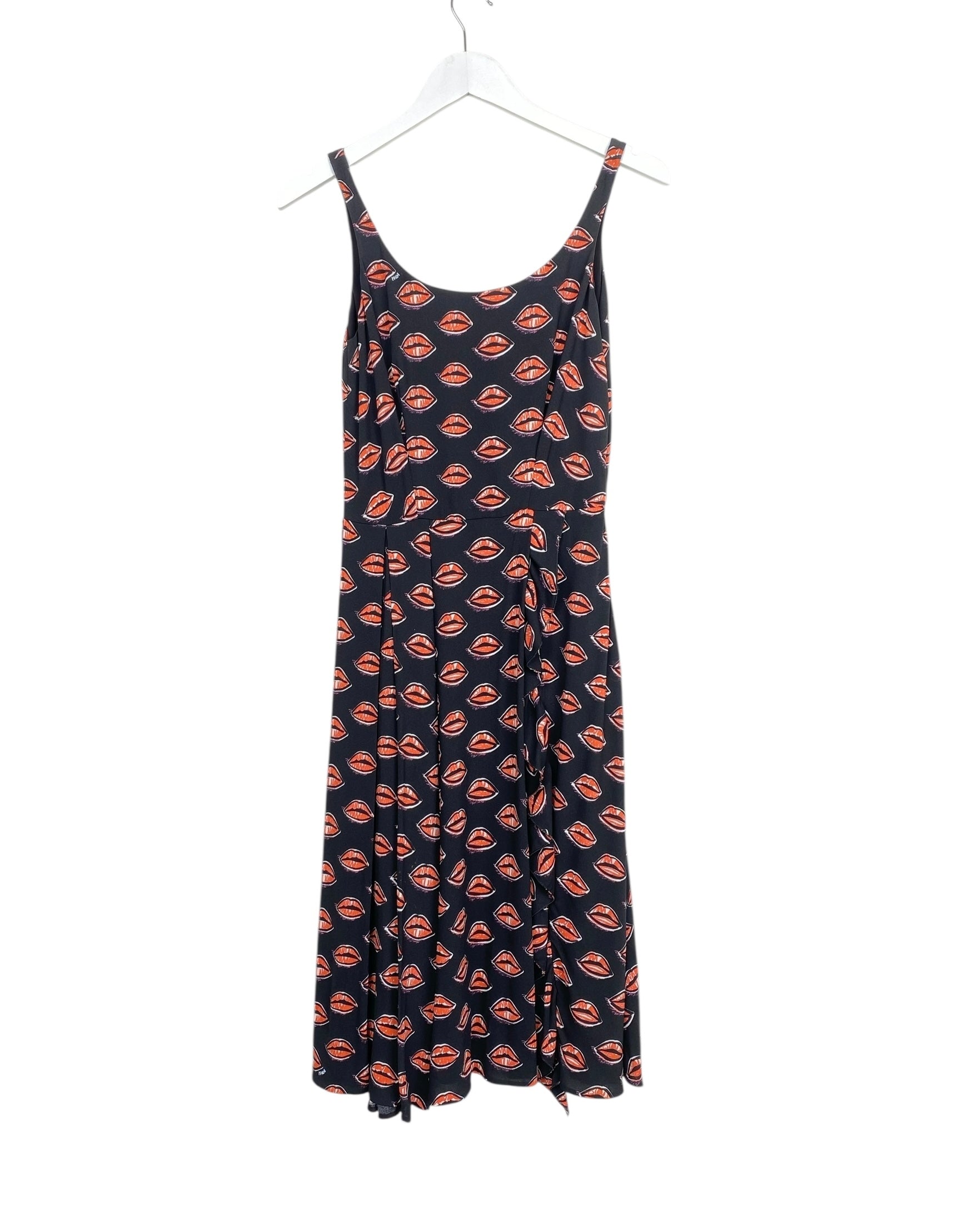 PRADA (2016) midi dress in pure silk with iconic "lips" print, red lips on a black background.